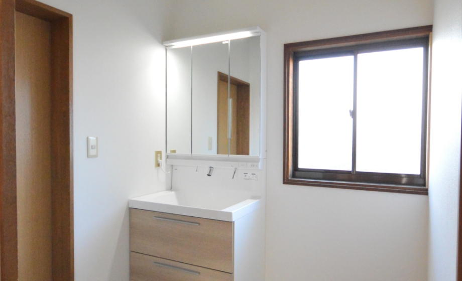 1面鏡を3面鏡に変更し、開き扉の収納を使いやすい引き出し収納に改めました。使いやすさが大幅に向上した洗面台です。また、照明も明るいLEDに変更しています。