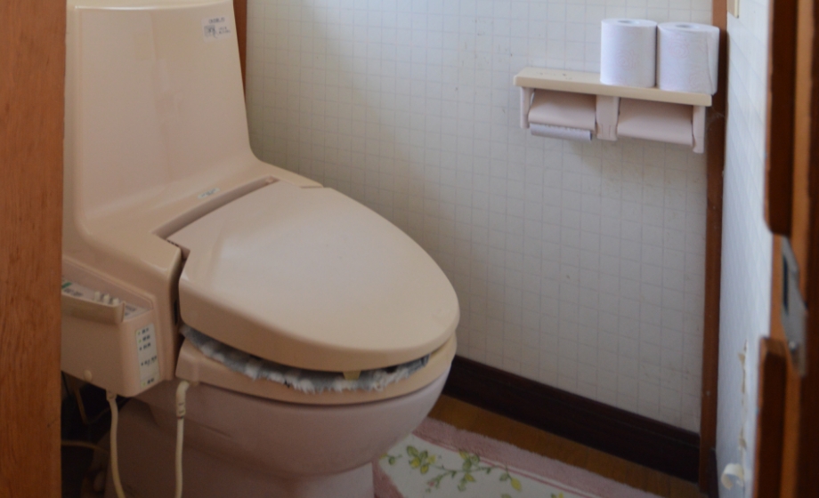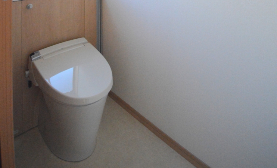 タンクを隠してスッキリしたデザインのトイレ。背面には収納もついています。昔と比べると大幅に節水できるので、水道代を削減できます。汚れが落ちやすい「アクアセラミック」のトイレです。