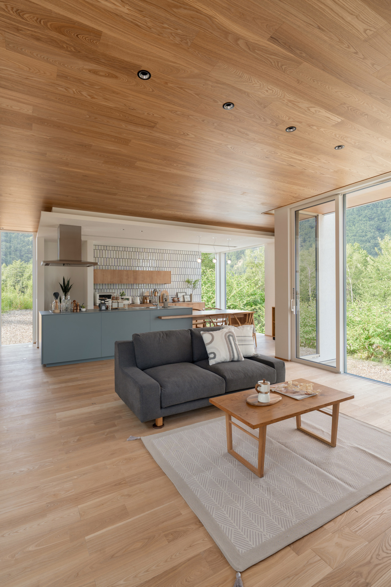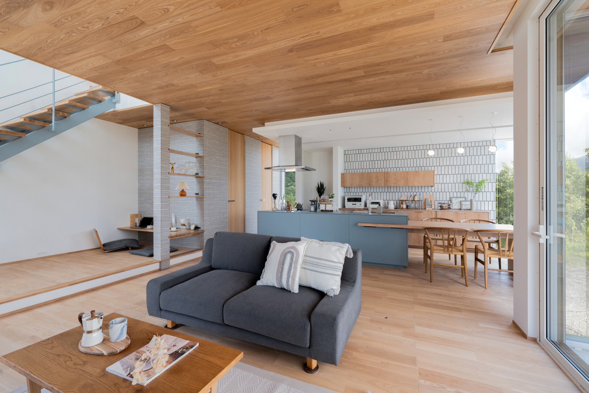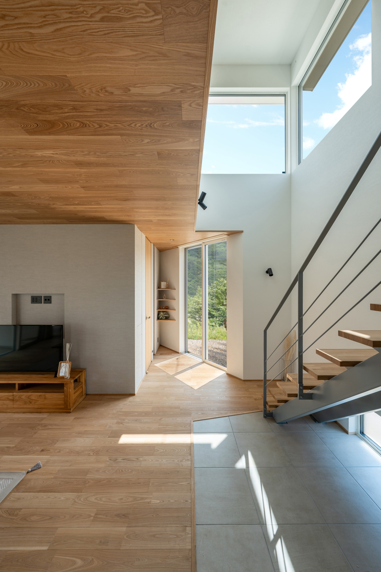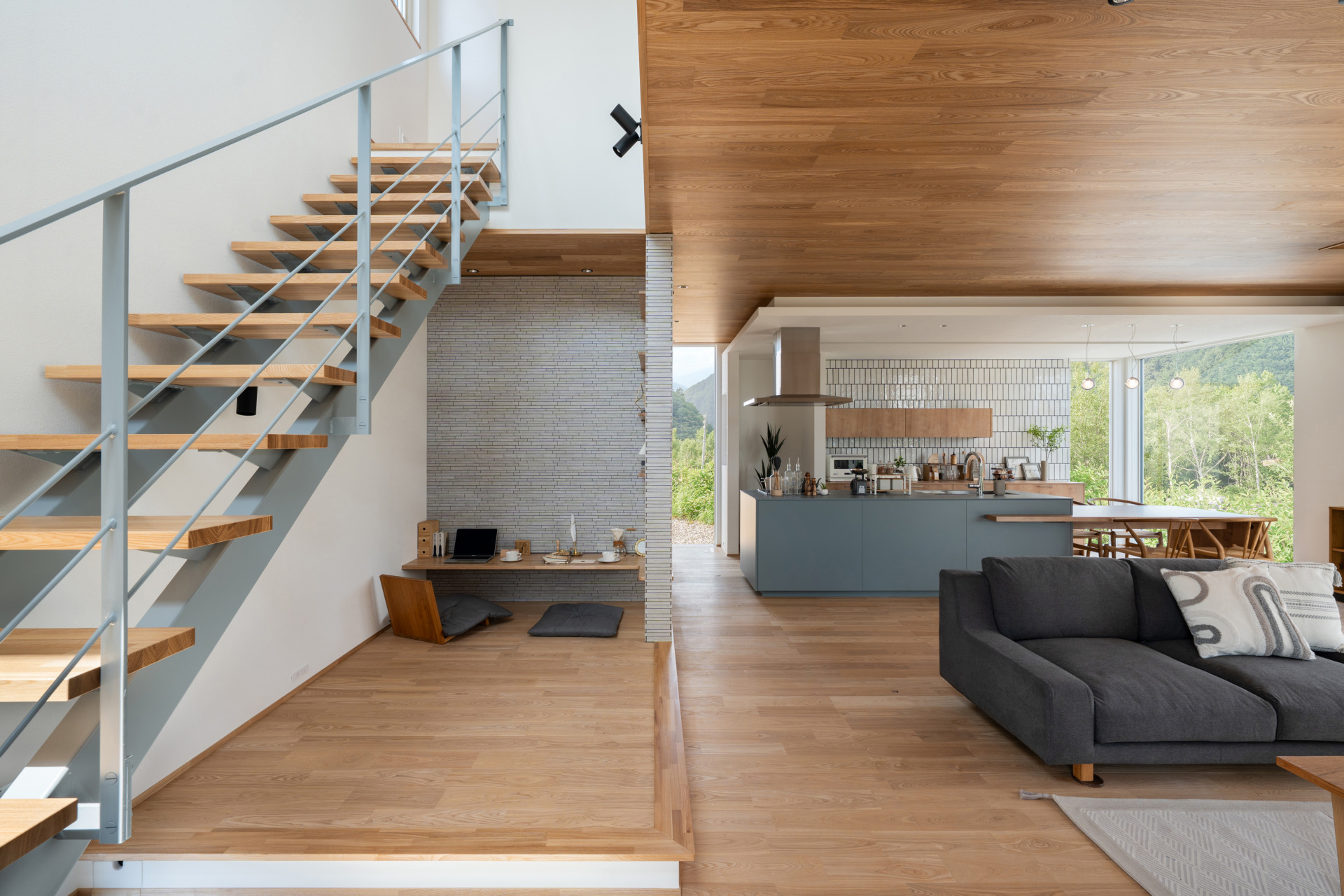 吹き抜けのあるLDK、天井までの大開口窓など、空間に余白を残す開放的で明るい住まい。