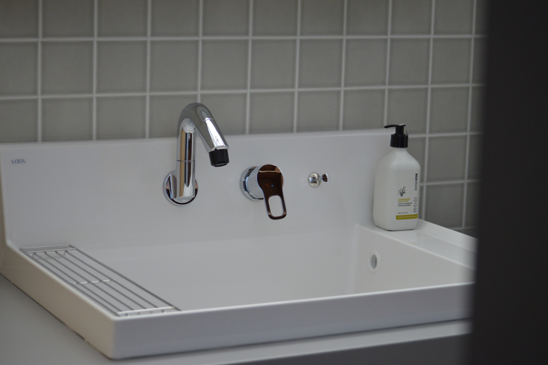 グレーのタイル調クロスと木の収納が調和した清潔感のある空間デザインです。