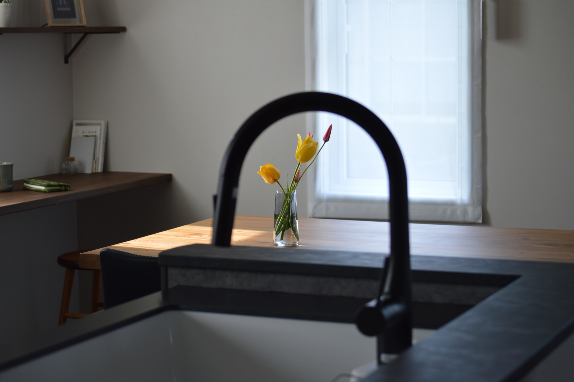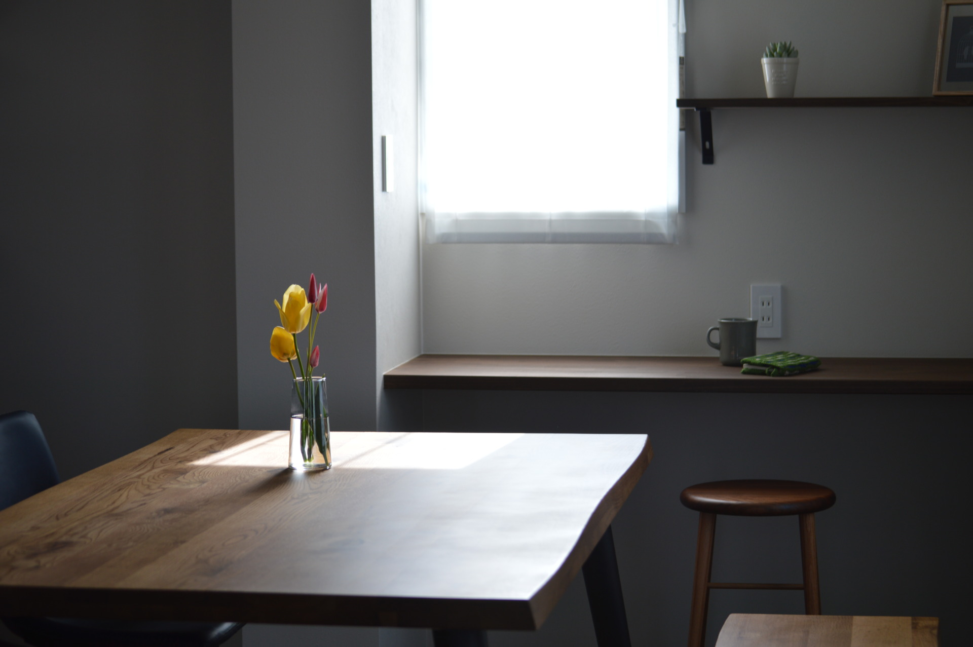 窓から自然の光が差し込む、造作カウンターのスペース。
